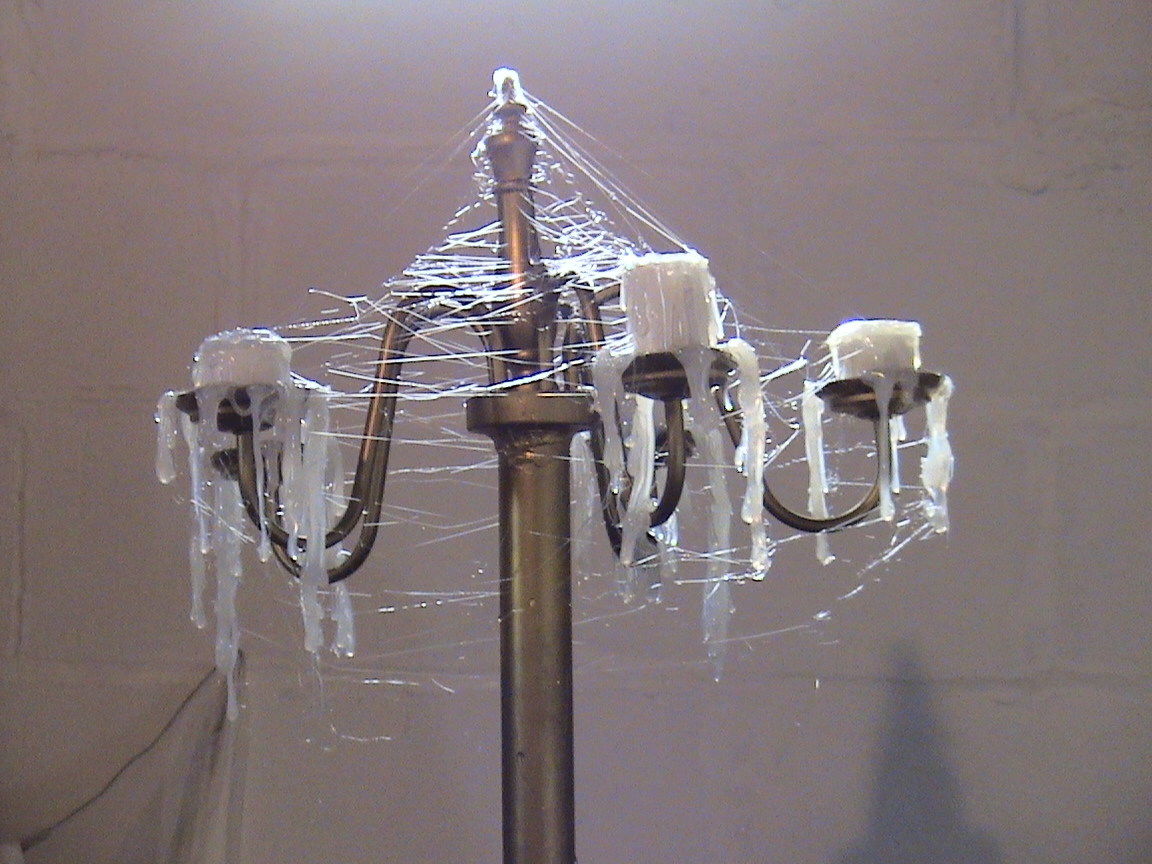 To add the effect of dripping wax to your candleabras take a hot glue gun (make sure to buy alot of glue sticks for this)and squirt the hot glue on the edge of the candle base and let it drip down, this will take many times of doing this to get "thicker drips". I have found that the best time to do this is either when you have the air conditioner on with fans going in the room and fanning the hot glue "drip" as it is dripping by hand with a piece of cardboard to slow it down. Or do outside when it is cold out. Make sure to put down news paper on what ever floor you are working on so you don't get glue on it! You can also make the look of spiderwebs on your candleabra by quickly squirting a small amount of glue out of the glue gun and quickly touching different places of the candleabra.