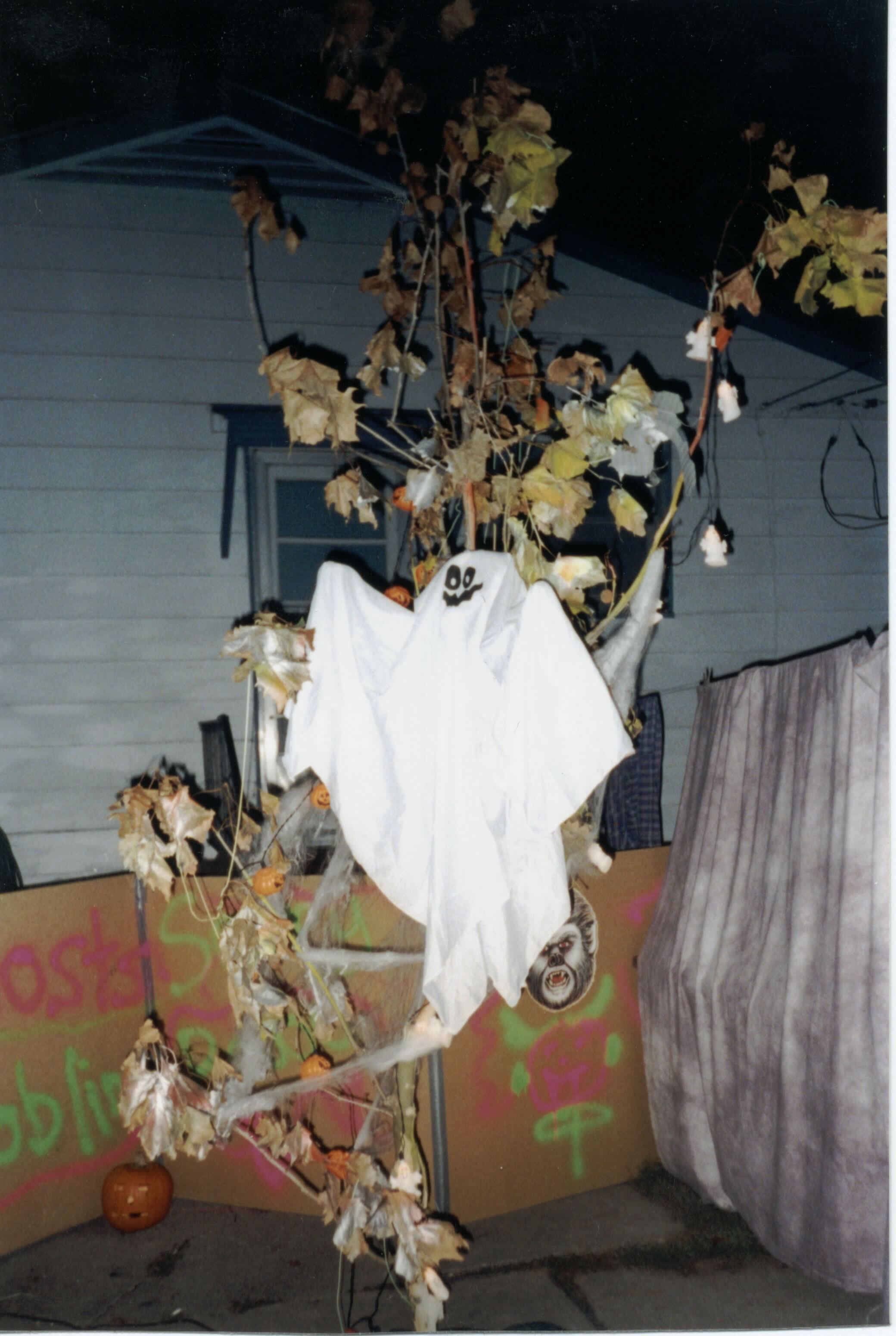 If you don't have any trees around in your yard but, would like a few or at least one here's what I did. Get a very, very large branch that has fallen off or from someone who has cut a tree down. A medium size branch is ok because you can always get small branches and hot glue them all around the medium branch to make it taller and wider. After you have the "tree" part, get either a medium size bucket or cardboard box with a garbage bag in it. Fill with quick cement and put the "tree" part in the center of the cement. Presto!! You now have a tree!!! Hang ghosts or lights on it and whatever else your creative mind thinks of!!! See picture below for reference.
