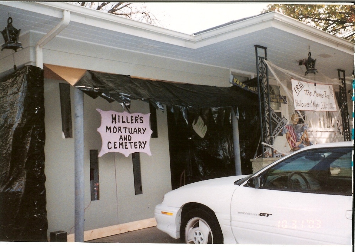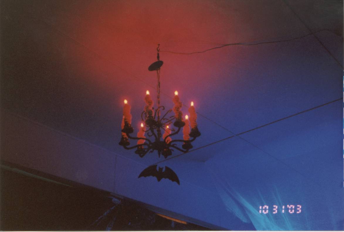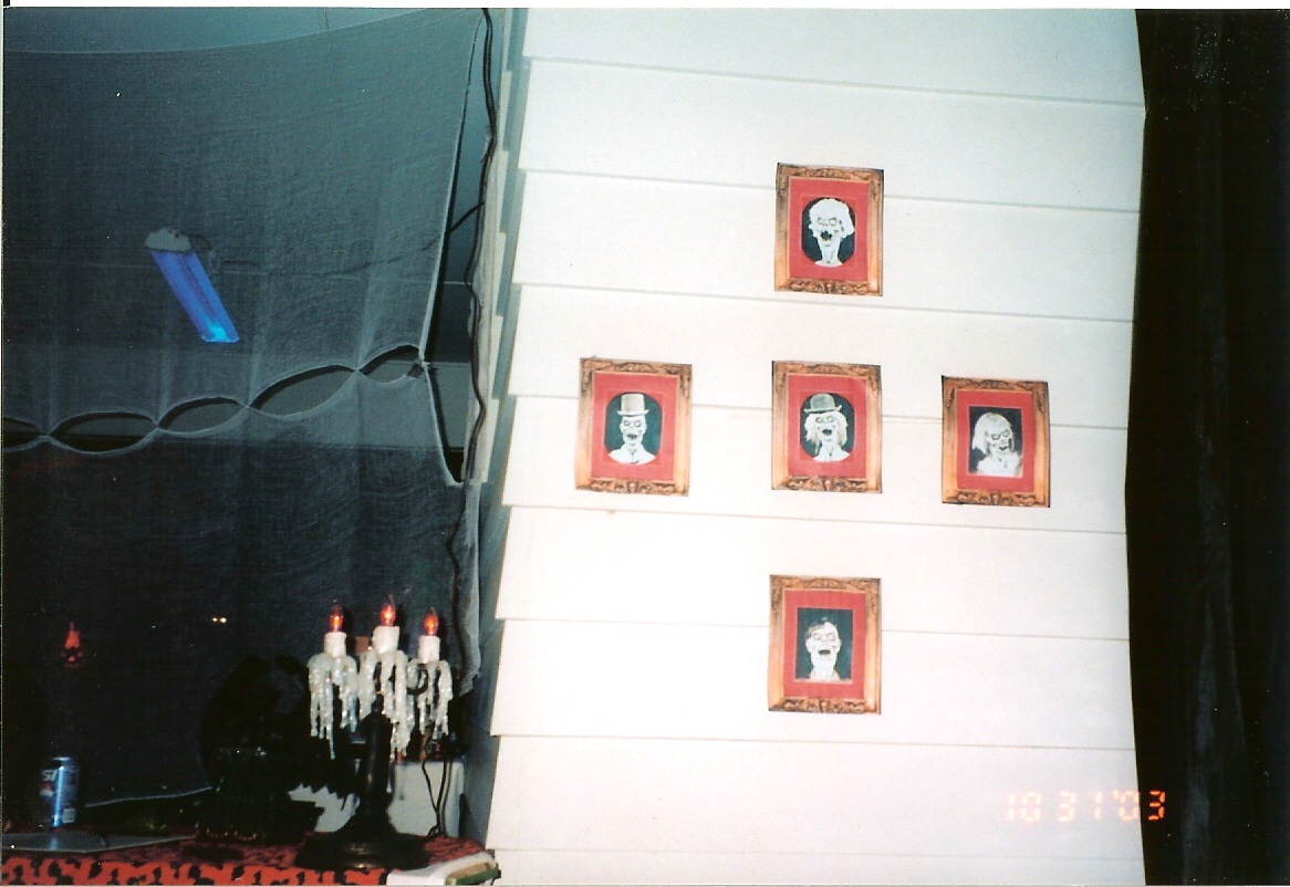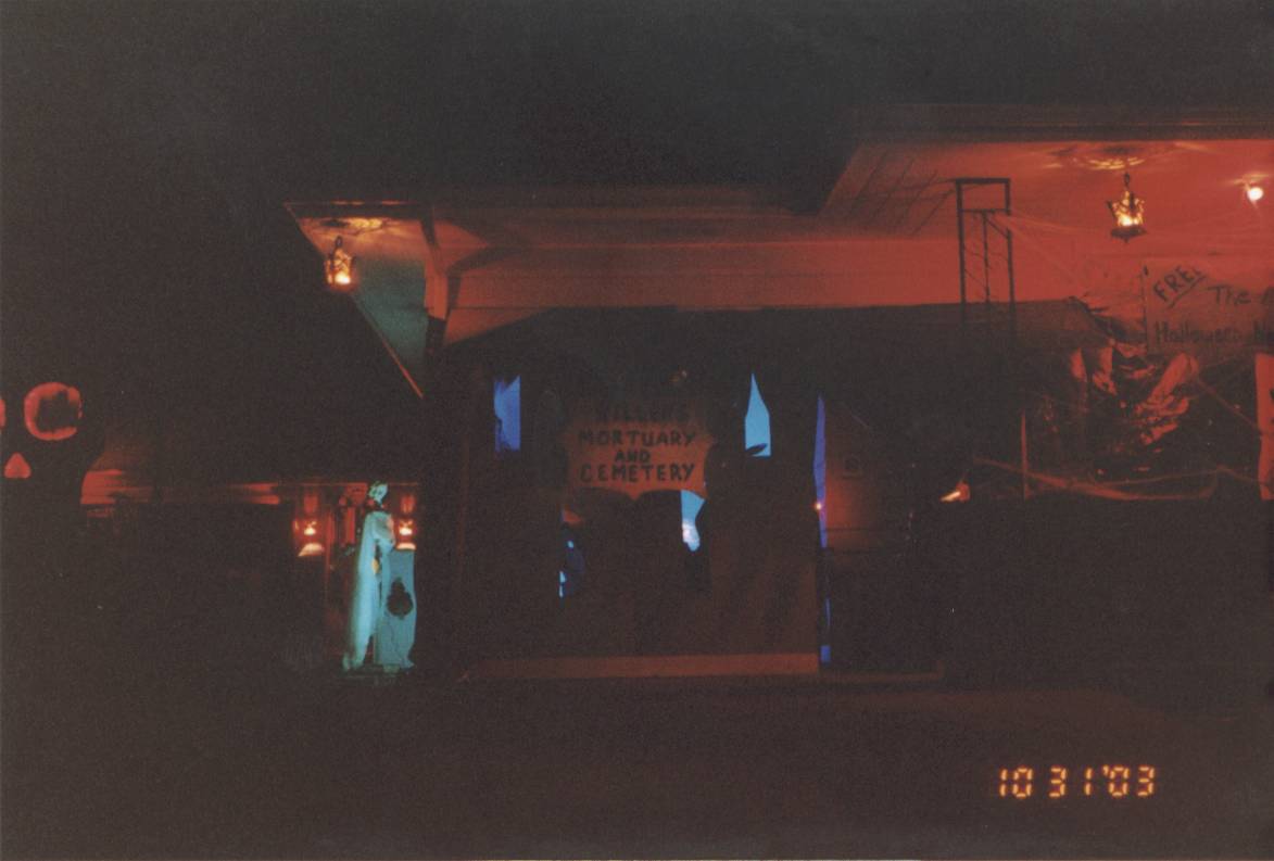 The MortuaryI made this the entry scene of my haunt in 2003. It was a great hit. On our carport I used chicken wire (for support) to enclose it. Then wrapped the chicken wire with black plastic. I used a couple of 4x8 sheets of pink polyurathane foam, cut a couple of windows in them, painted them grey and attached them to the front of the carport leaving a large enough space on the far right side for the entrance door. Put cardboard on the top slanted and covered with black plastic for the roof. I got a couple of large carboard tubes that I painted an used as podeums. Hung flickering lanterns by the front door. When you walked in you first scene ghouls and skeletons sitting in some chairs, waiting their turn to check in with a nice haunted candlelabra I made hanging above. Then a few feet from the door was a table with a guest book, haunted table lamp, and some glowing shredded cheesecloth that you had to walk through. On the other side was the lab. Here are some pictures below....... |